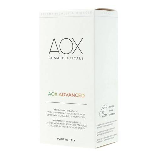 AOX Advanced Descrizione Avanzato siero antiossidante ad alta concentrazione, con vitamina C, acido ferulico, acido fitico, e tocoferolo. Previene l'invecchiamento cutaneo stimolando la sintesi di collagene. Schiarisce le macchie cutanee ed aiuta a prevenirne la formazione. Senza profumo. ... Leggi tutto