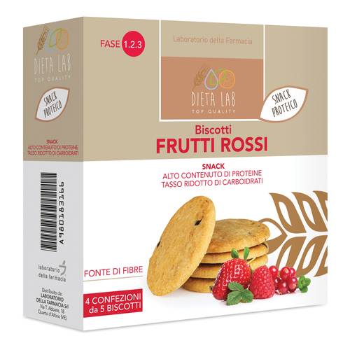 DIETALAB Biscotti Frutti RossiDescrizione Snack ad alto contenuto di proteine, tasso ridotto di carboidrati e fonte di fibre. Biscotti ai frutti rossi. Ingredienti Proteine del latte; olio di palma; farina di grano; amido di grano; frutti rossi a pezzi (purea e succo di mela concentrato,... Leggi tutto