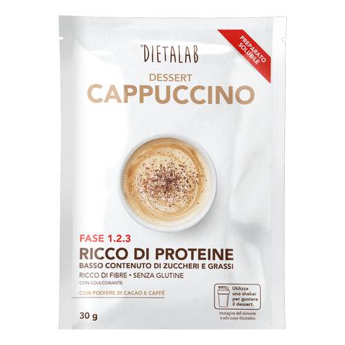 DIETALAB CAPPUCCINODescrizione Preparato solubile per bevanda al sapore di cappuccino. Ingredienti Proteine del latte, aromi, caffè solubile (3,9%), gomma tara, fibra solubile da mais, L-lisina, cacao in polvere, biossido di silicio, cloruro di sodio, L-triptofano, caramello in polvere; ed... Leggi tutto