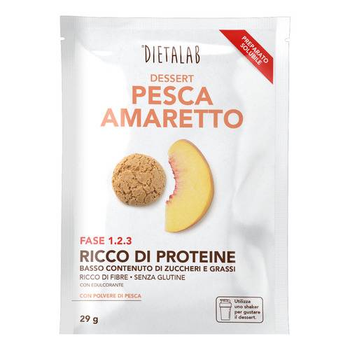 DIETALAB PESCA AMARETTODescrizione Preparato solubile per bevanda al sapore di pesca e amaretto. Ingredienti Proteine del latte, fibra solubile da mais, gomma tara, aromi, biossido di silicio, pesca frutto in polvere (1,4%), cloruro di sodio, L-fenilalanina, L-metionina; edulcorante: sucra... Leggi tutto