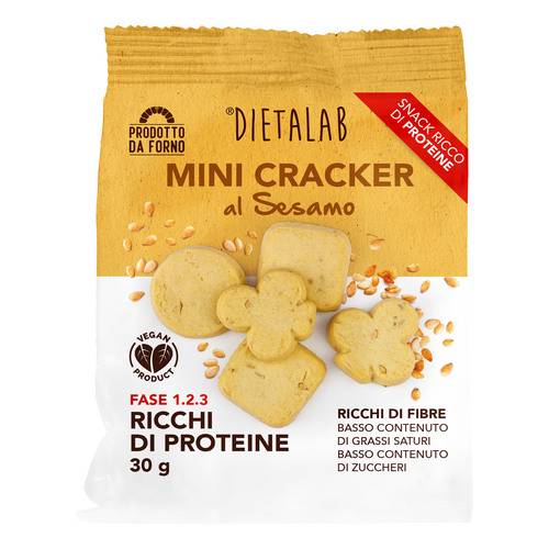 DIETALAB MINI CRACKERDescrizione Mini cracker al sesamo. Ingredienti Amido modificato di frumento, proteine isolate di soia, proteine testurizzate di frumento, semola di grano duro, farina di ceci, olio di semi di girasole, fibra di avena, olio extravergine d'oliva, semi di sesam... Leggi tutto