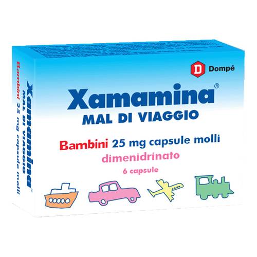 Xamamina mal di viaggio 50 mg capsule molli, una capsula molle contiene; principio attivo: dimenidrinato 50 mg. Eccipienti: sorbitolo, parabeni. Xamamina mal di viaggio Bambini 25 mg capsule molli, una capsulamolle contiene; principio attivo: dimenidrinato 25 mg. Eccipienti: sorbitolo, parabeni. Per l'elenco completo degli eccipienti, vedere paragrafo 6.1